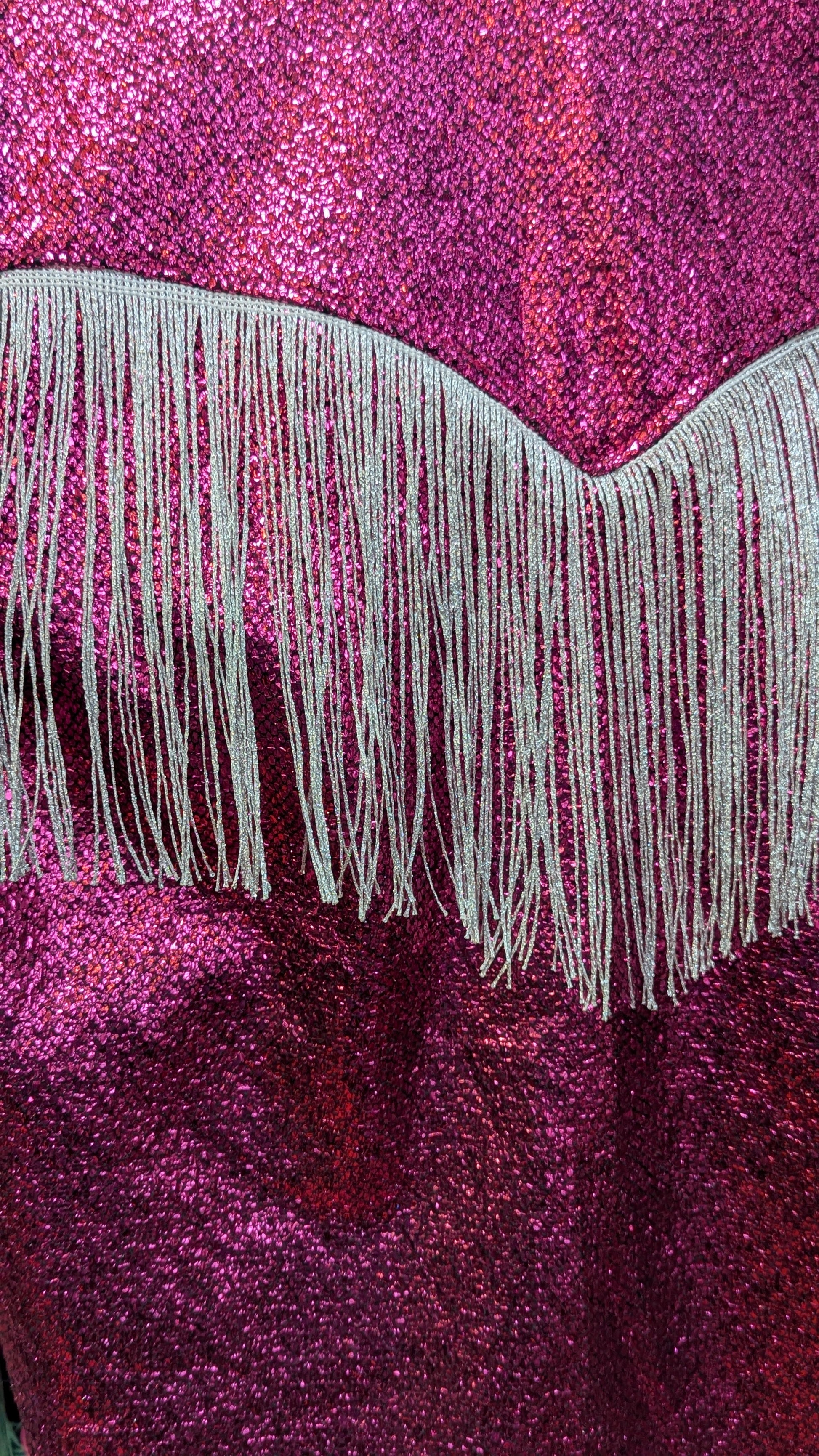 This is THE JACKET!! Blue metallic snakeskin fabric finished off with sparkling silver fringing across the back and down the arms. Complete with side pockets and oversized collar for the ultimate retro rodeo feel! We love them for an all-year-round colour pop that's comfy too.