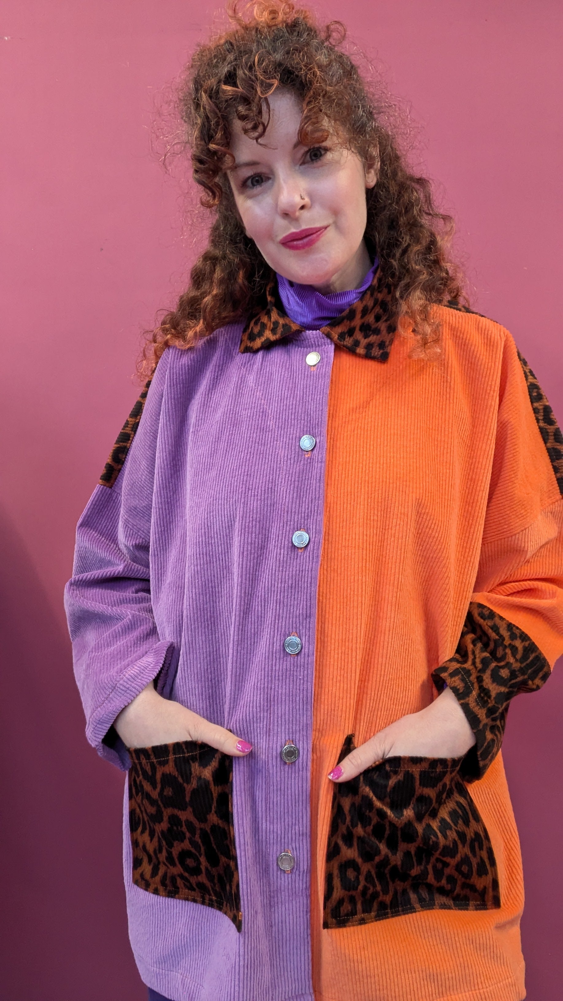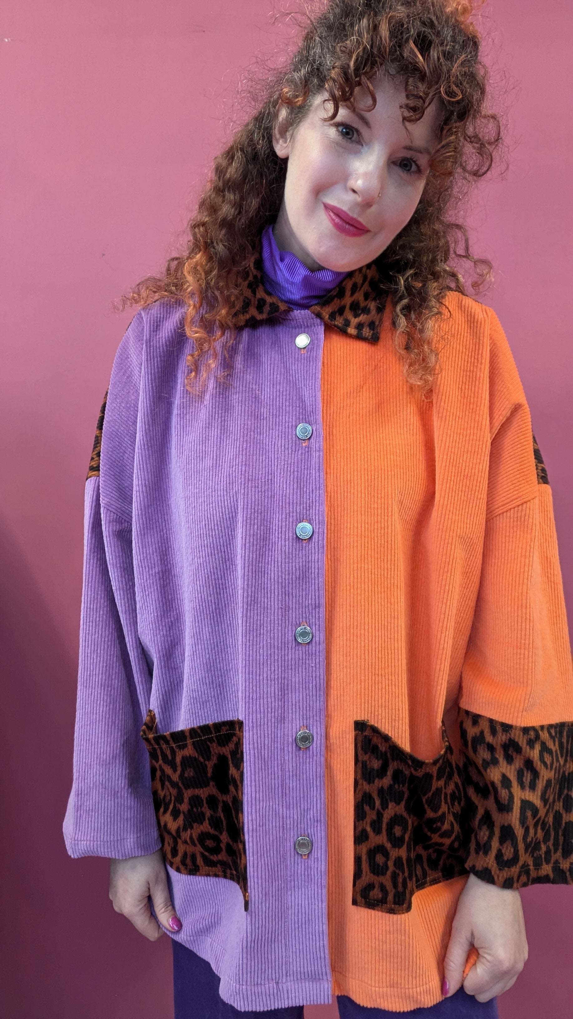 Colour Block Cord Long Chore Jacket in Purple and Leopard