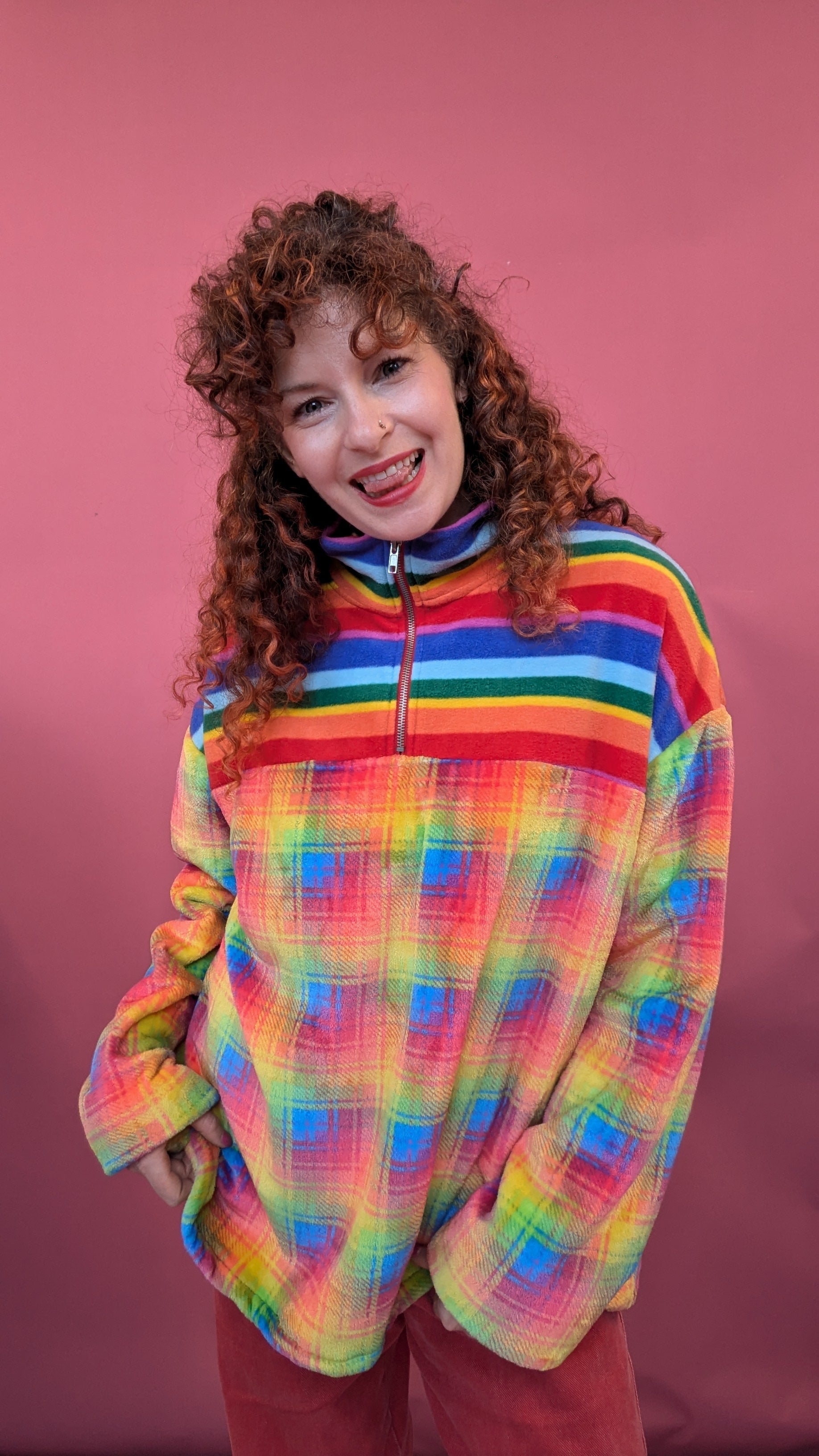 Half Zip Lite in Rainbow Plaid and Rainbow Stripe Fleece