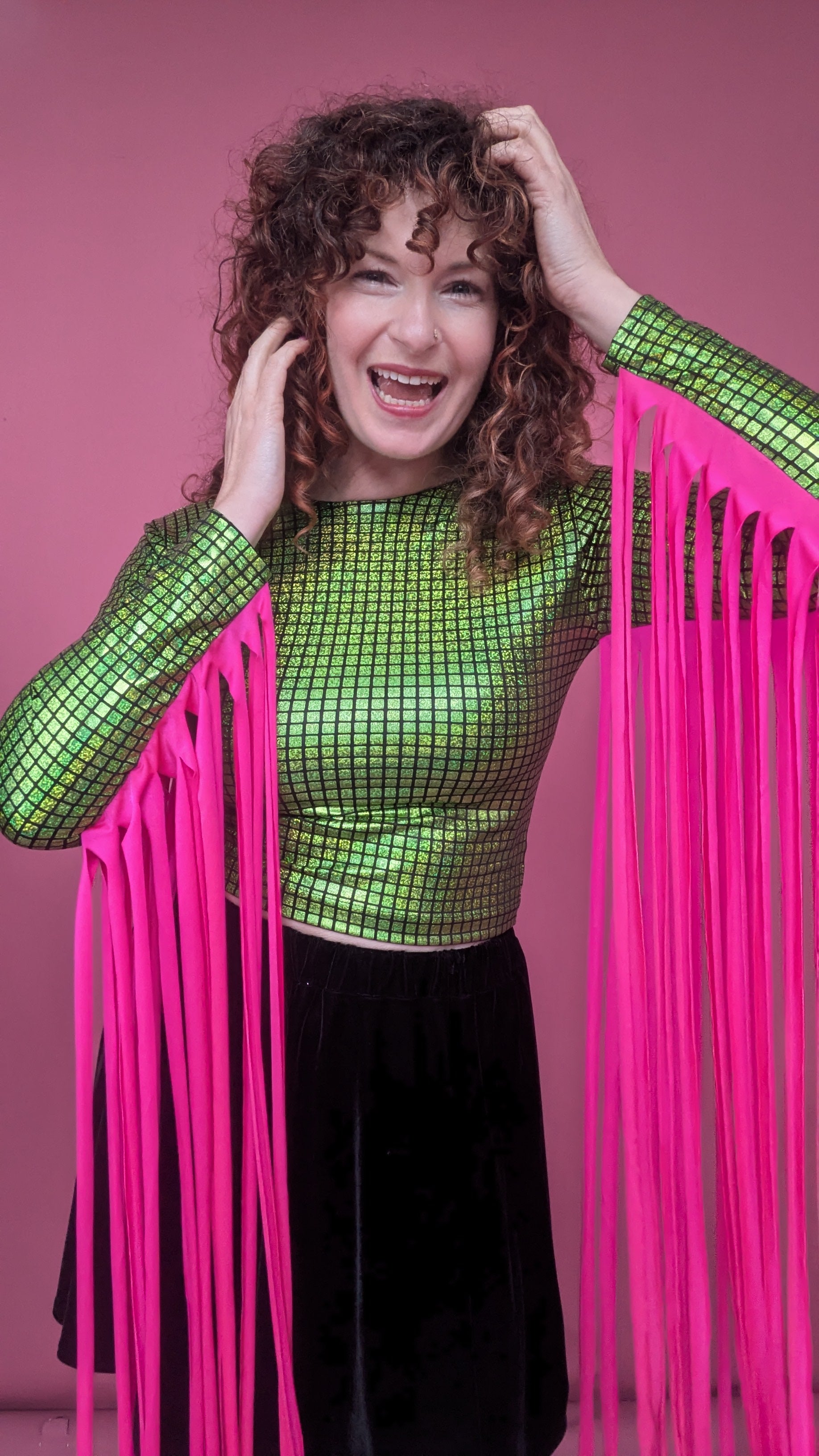 This fringe crop top is a go-to festival wardrobe staple. The XL hot pink fringing is perfect for making an impact on any dancefloor! Fringing has a 30" drop!ย