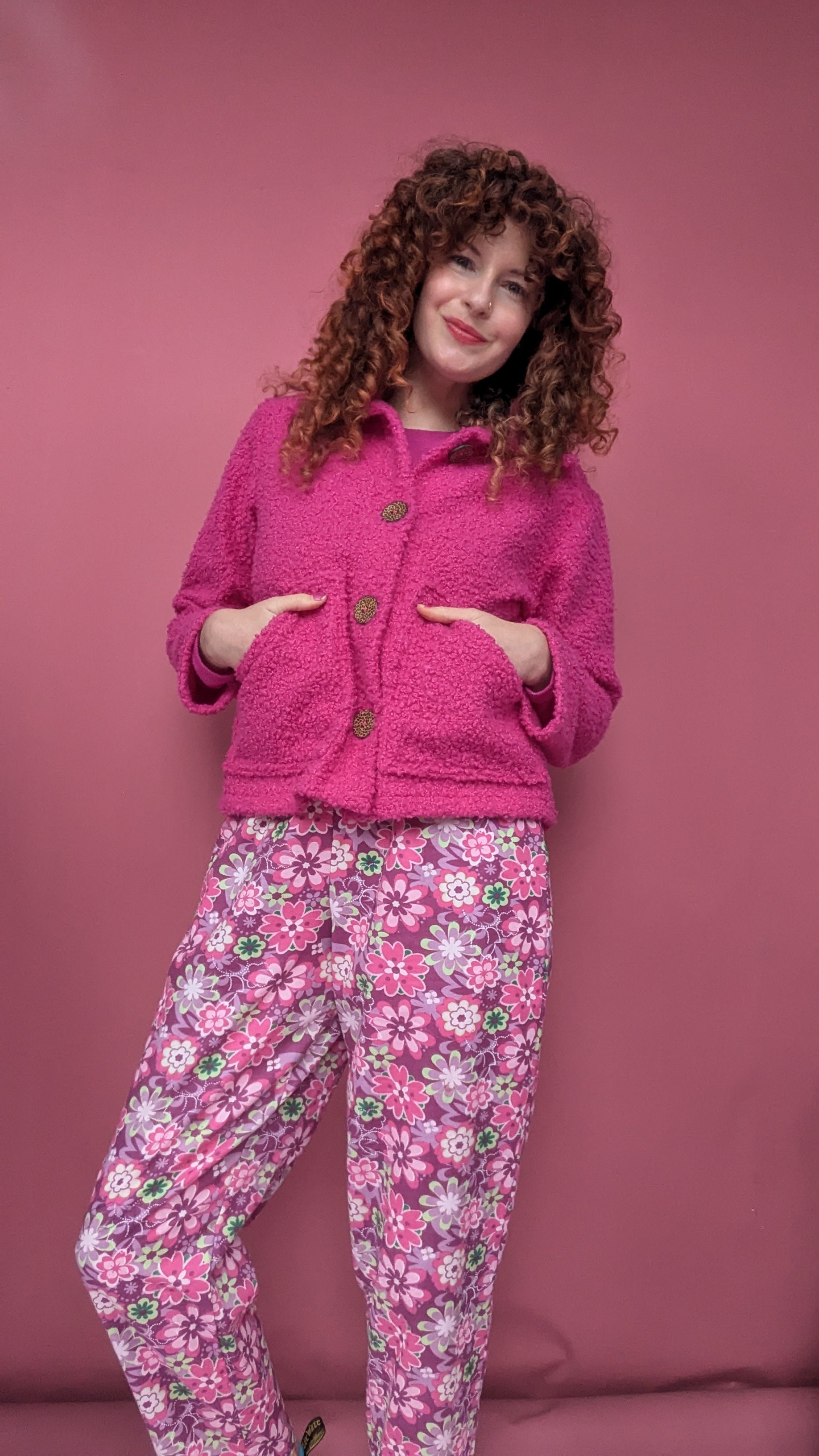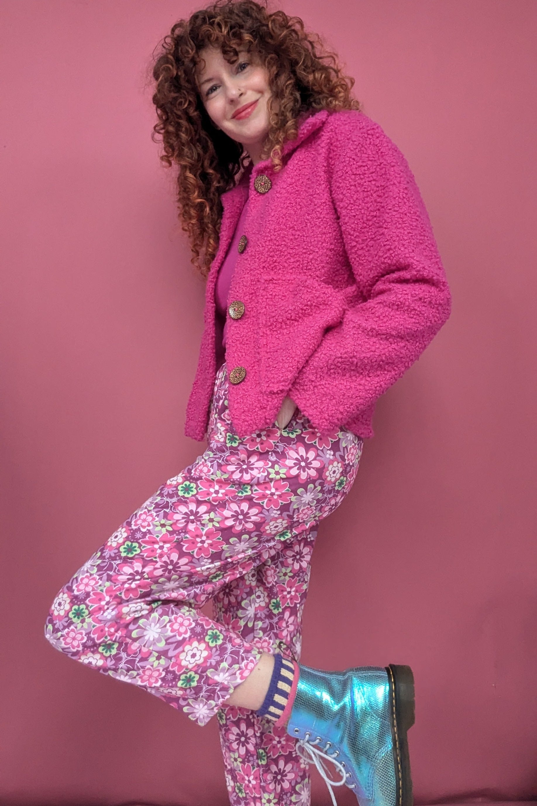 Easy to wear, ankle grazing trousers in the cutest retro floral needlecord - it's giving absolute 90s Polly Pocket energy! Pull on style with elastic at back waist and front pockets. Relaxed fit and super comfortable.