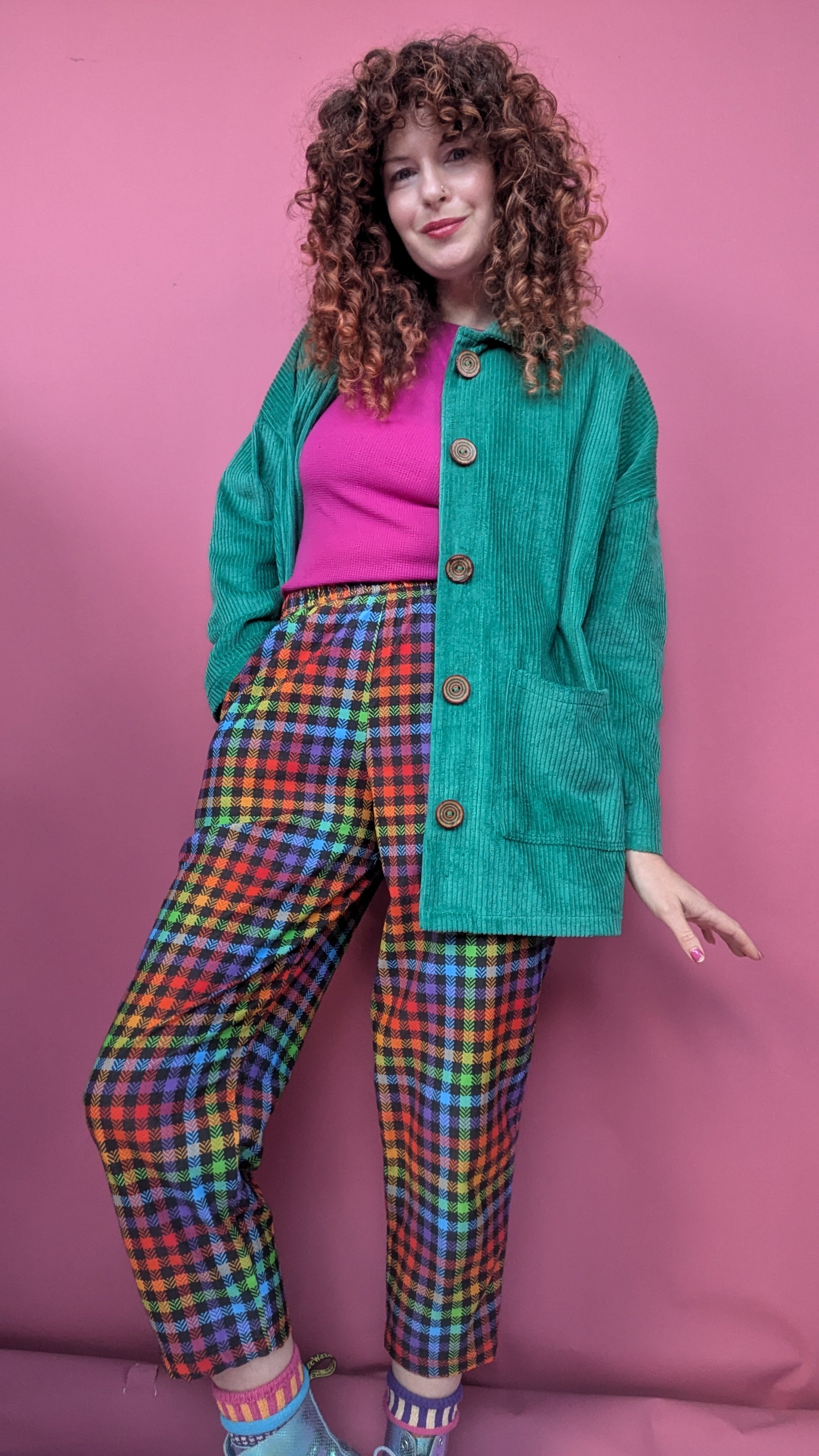 Easy to wear, ankle grazing trousers in the cutest rainbow gingham needlecord! Pull on style with elastic at back waist and front pockets. Relaxed fit and super comfortable.