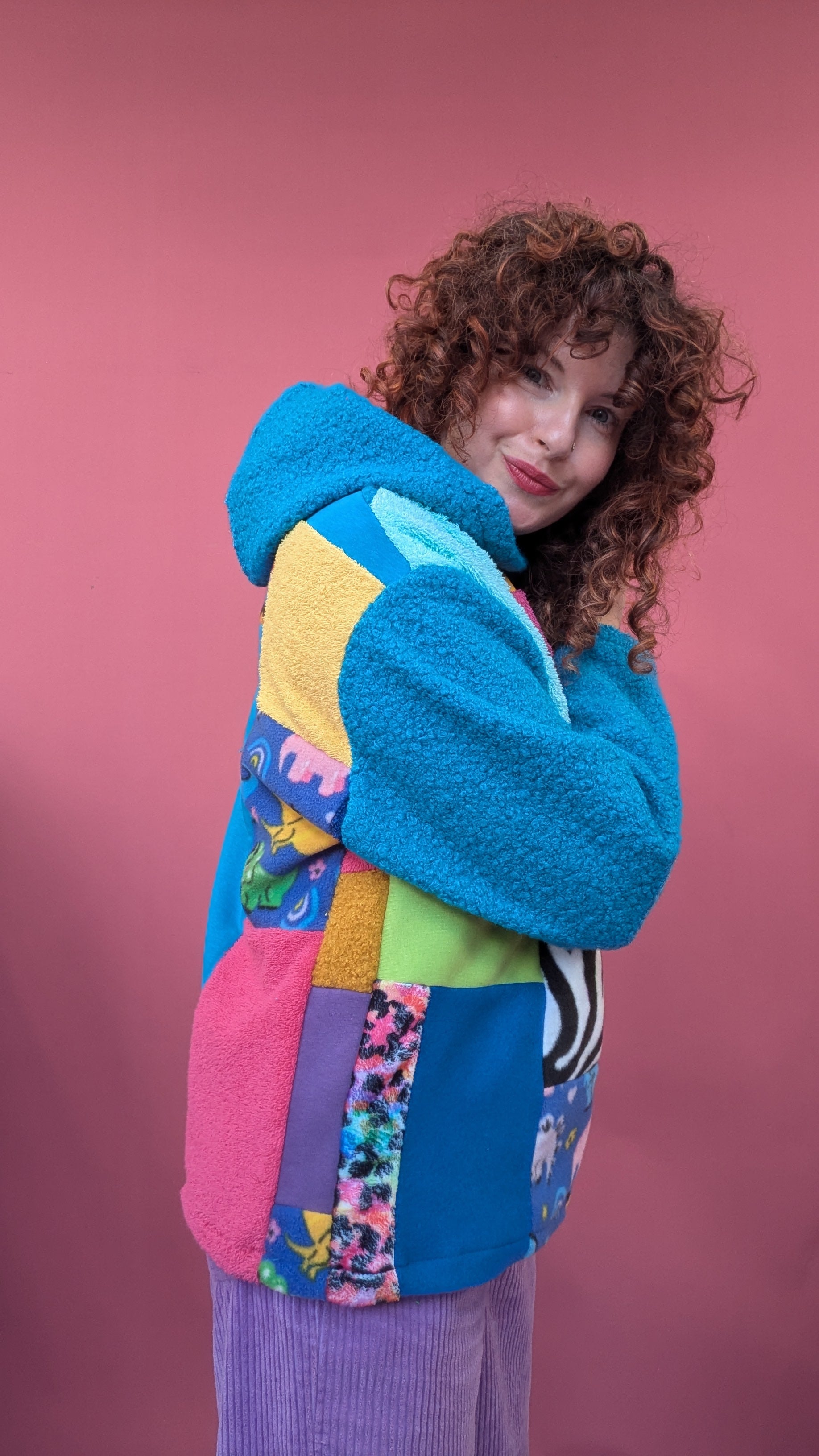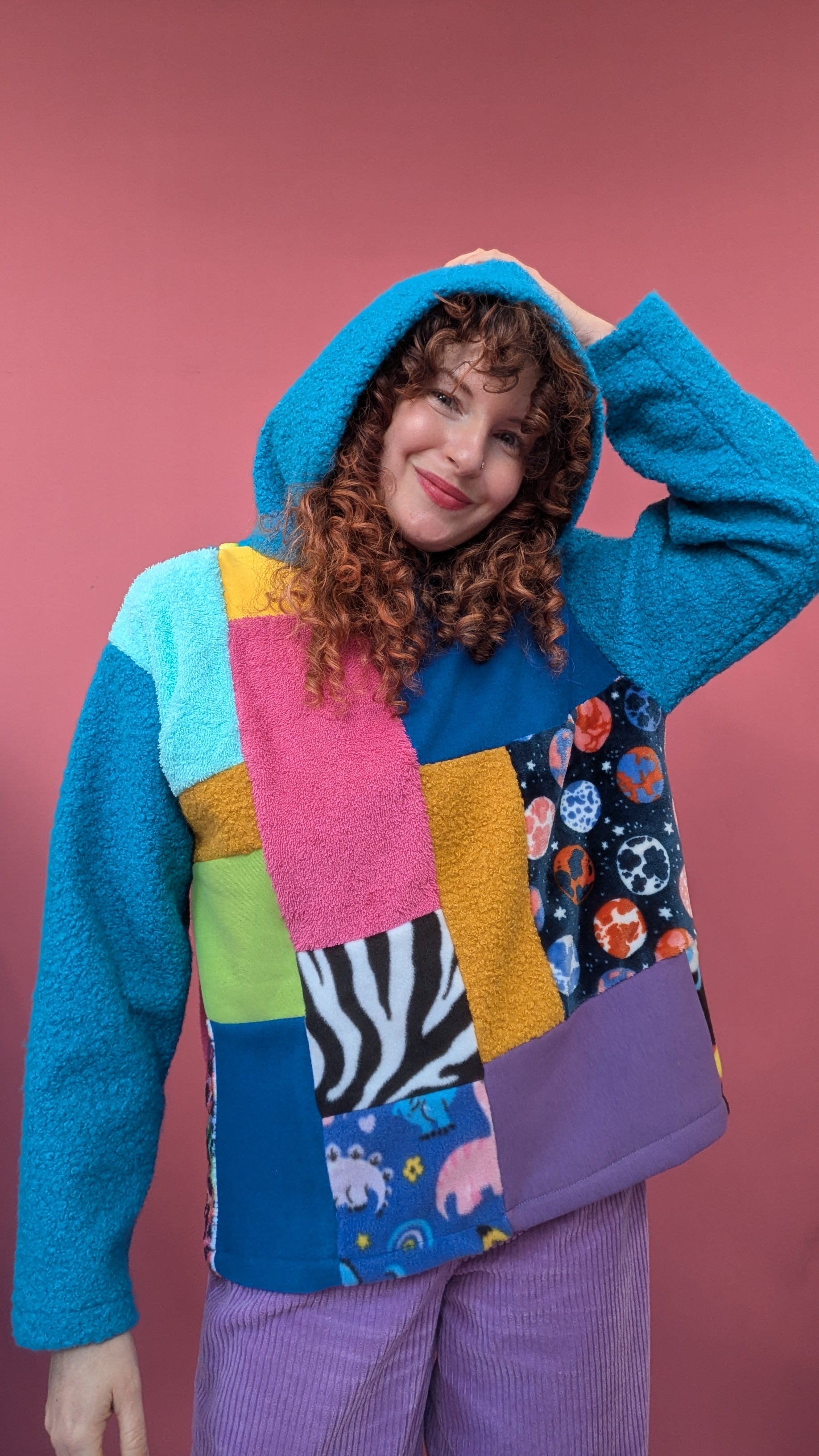 These patchwork pullovers are a fun combo of our signature printed fleeces, cotton jerseys and cosy remnants!