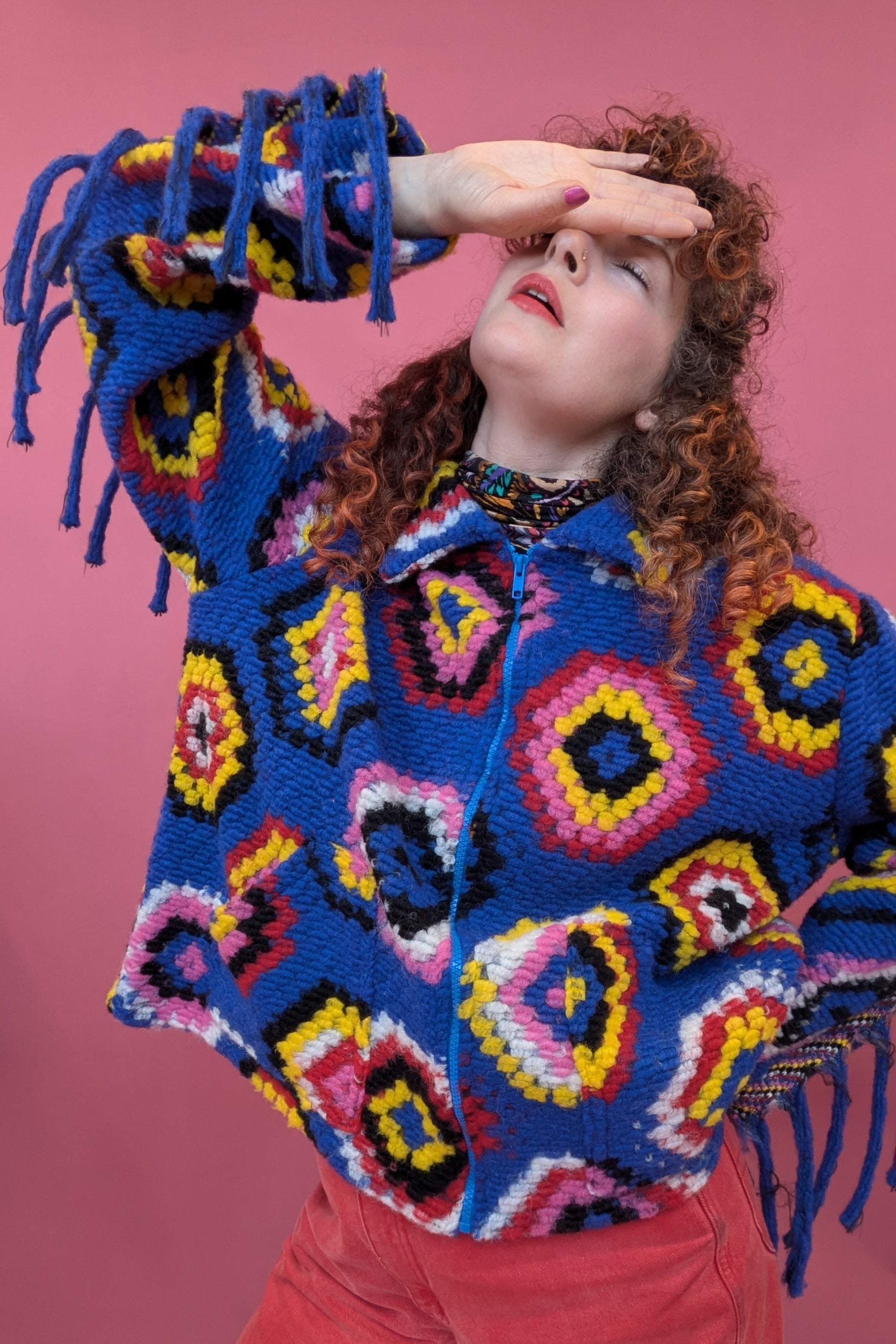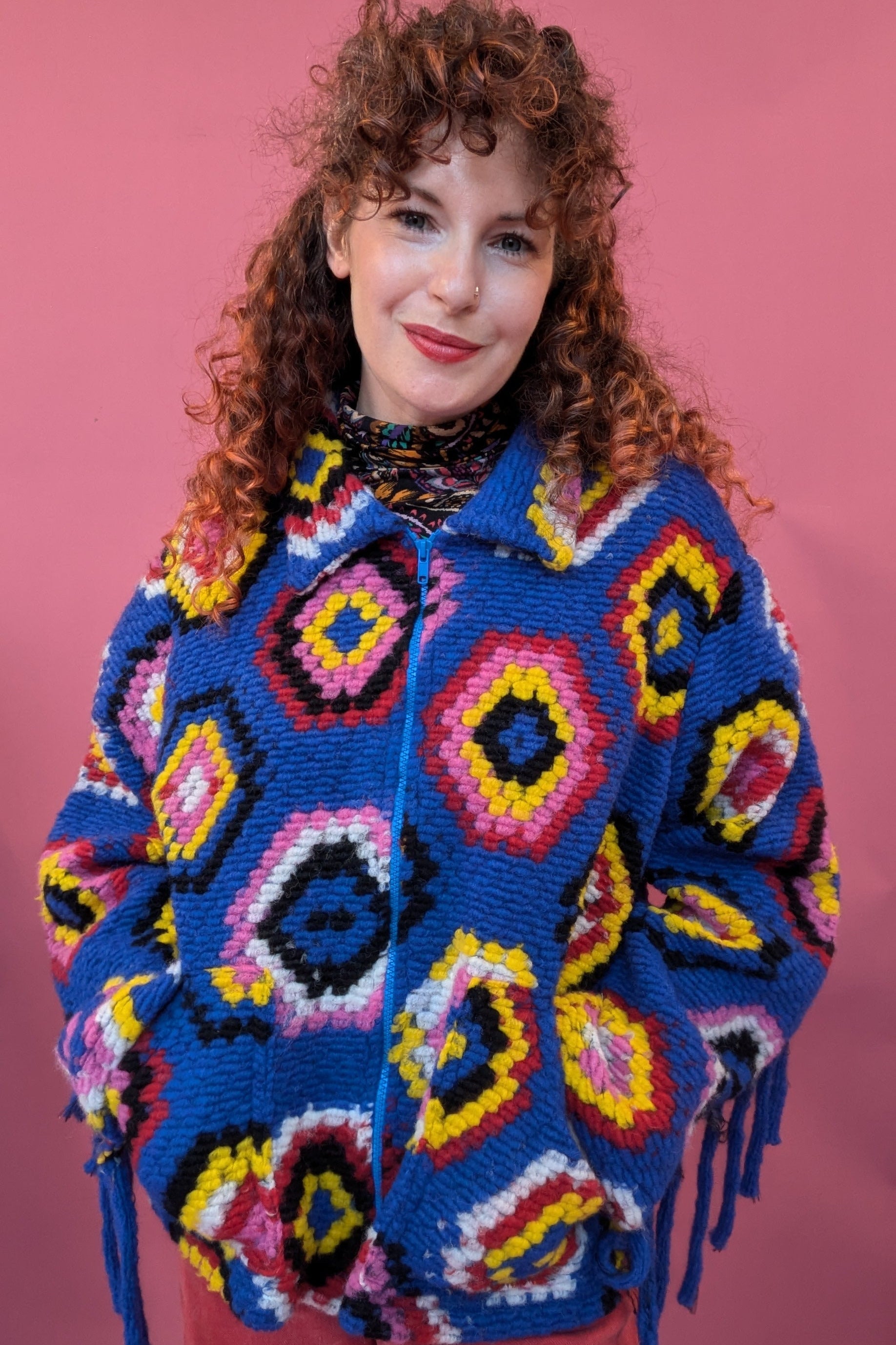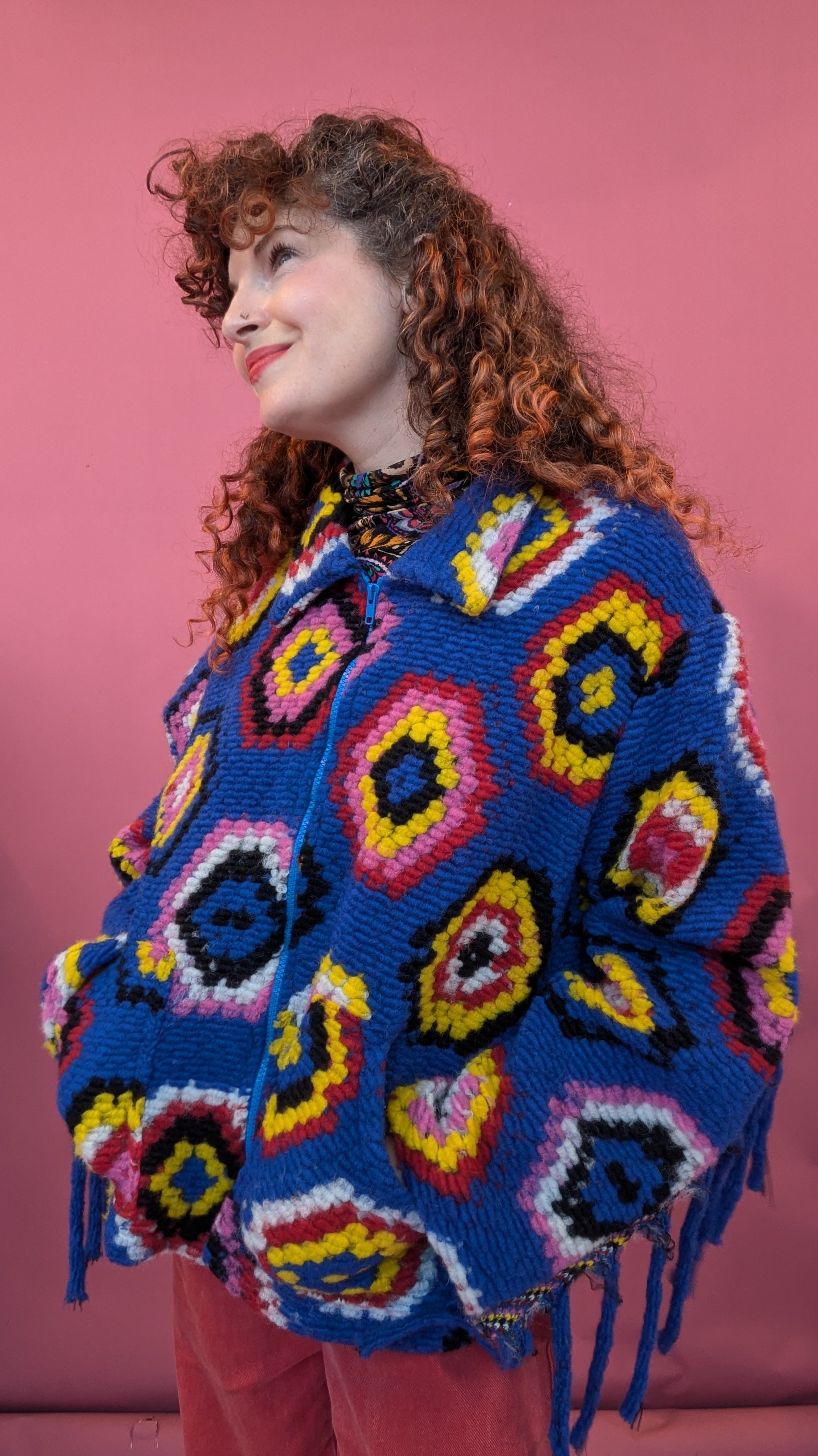Handmade cropped jacket in super special faux crochet. Features nylon zip closure, square collar and front patch pockets. The fringe tassel along the back yoke and sleeves add that extra touch. This fun and funky jacket is a STUNNER!ย